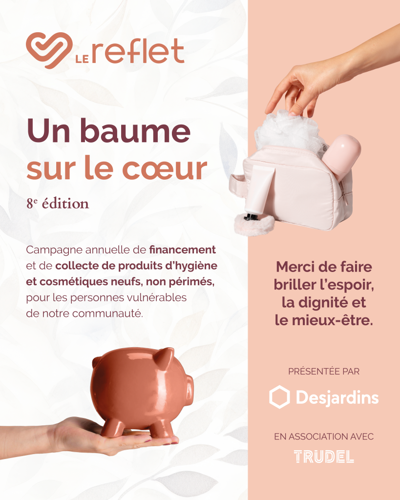 Selon un sondage réalisé au printemps 2025 avec la collaboration de la firme Léger, plus de 1 personne sur 3 a de la difficulté à se procurer des produits d’hygiène dans le contexte économique actuel. Chez les jeunes, c’est plus de 1 jeune sur 2. C’est une réalité alarmante et Le Reflet (anciennement Vide ta sacoche) est le seul organisme au Québec qui a comme mission de lutter contre la précarité hygiénique.